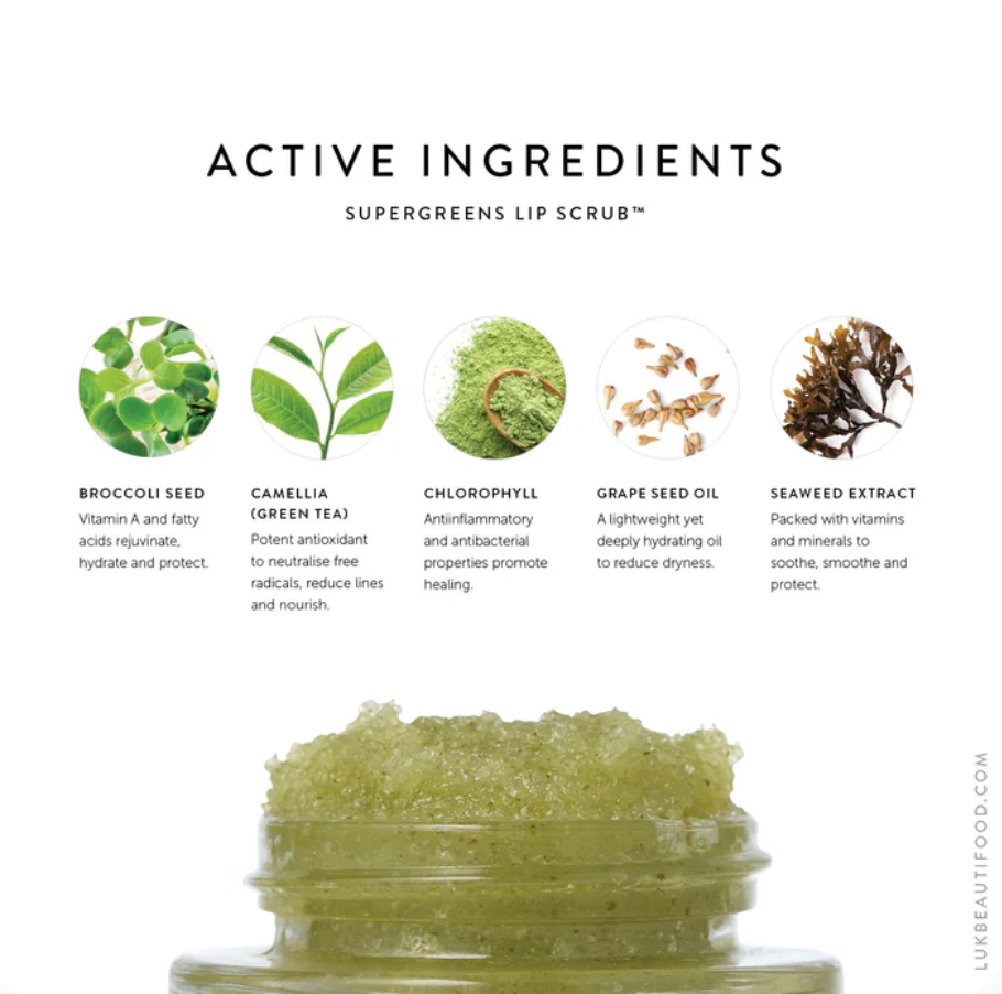 A supercharged dry lip polish to replenish, refine and smooth lips. Supergreens Lip Scrub is power pot of antioxidants and potent superfoods that refine lips by smoothing over lines and re-invigorating colour and shape. It’s packed with Vitamin C and chlorophyll from broccoli and herbs to fight free radicals that produce fines lines, and collagen protein from seaweed to help, smooth and redefine.