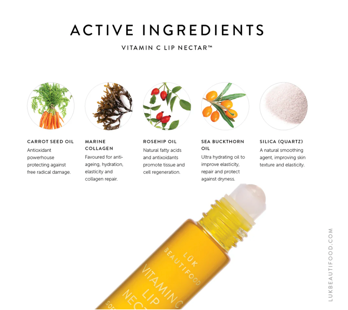 Condition and smooth over fine vertical lines and even out lip surface. Ideal on ‘cupids bow and surrounding lip areas. If you don’t colour with Lük Lip Nourish™, prime lips with Lük Vitamin C Nectar to minimise drying that typically occurs with traditional chemical lipsticks.